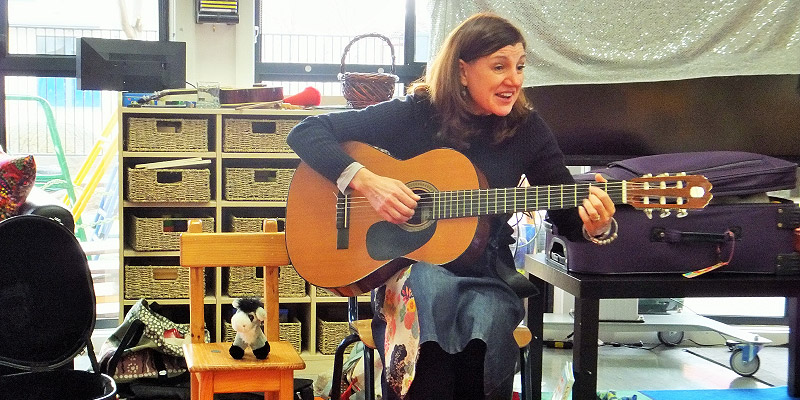 I incorporate literacy within my program as often as possible. Spoken word combined with rhythm activities such as clapping or stamping or played on percussion instruments is another way to connect music with language. Books are included as a tool to connect with the various musical activities of the lesson. One such example is playing musical instruments or adding movement to accompany a story. Within this structure the children will be experiencing the beginning of musical form, rhythm, and beat repetition. They will experience hearing and using musical instruments experimenting with dynamics of sound, improvisation, vocalization and dramatization.